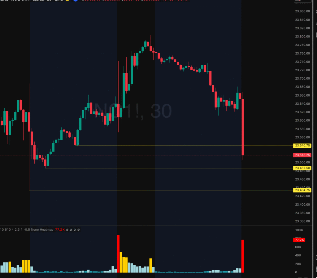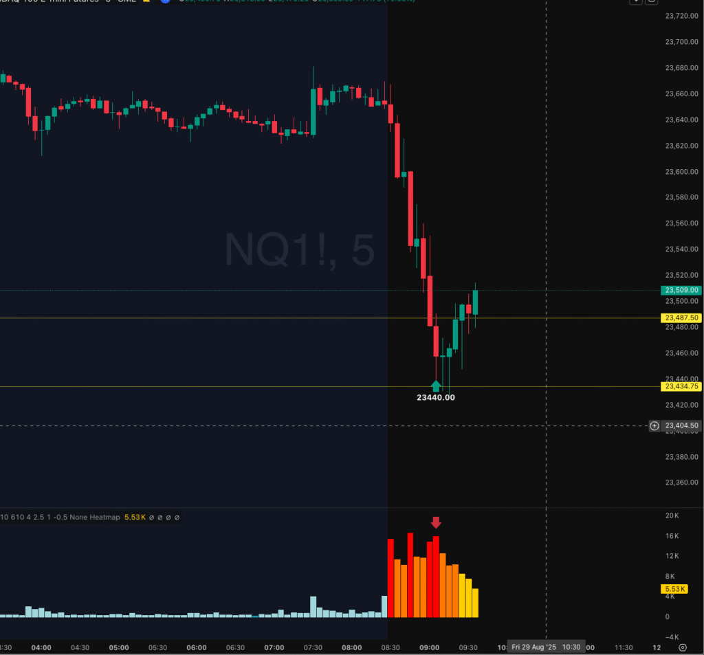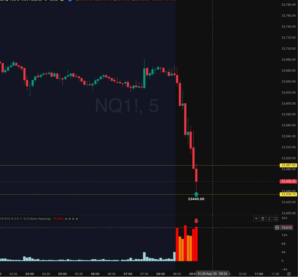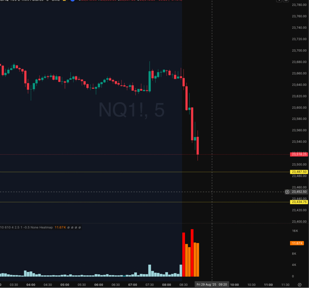 On August 29th, 2025, NASDAQ on the 30-minute chart moved quickly lower early in the session, heading into two pivot points at 23,487 and 23,434. I was watching for a potential trade to the upside.