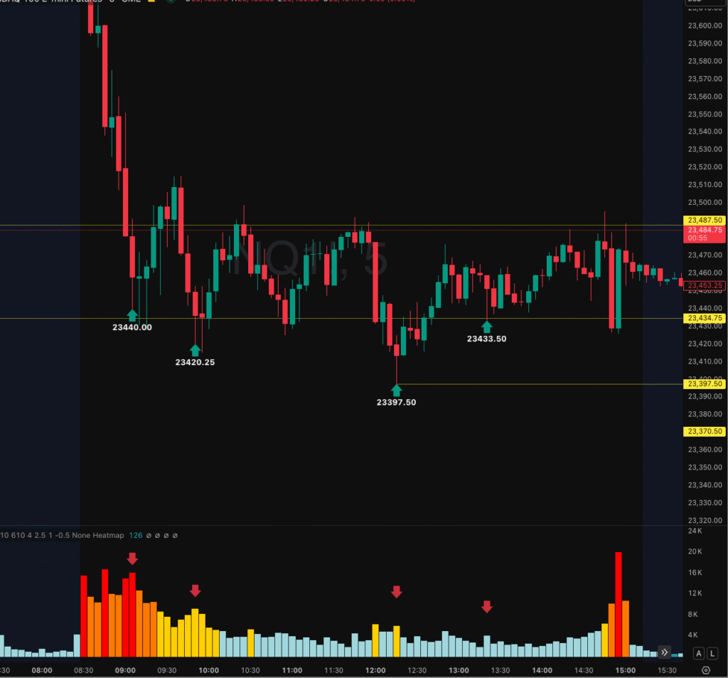 For the next 15 minutes, price repeatedly tested the 23,434–23,440 area. Buyers defended the level time, and eventually price pushed back up to 23,487, hitting my target.